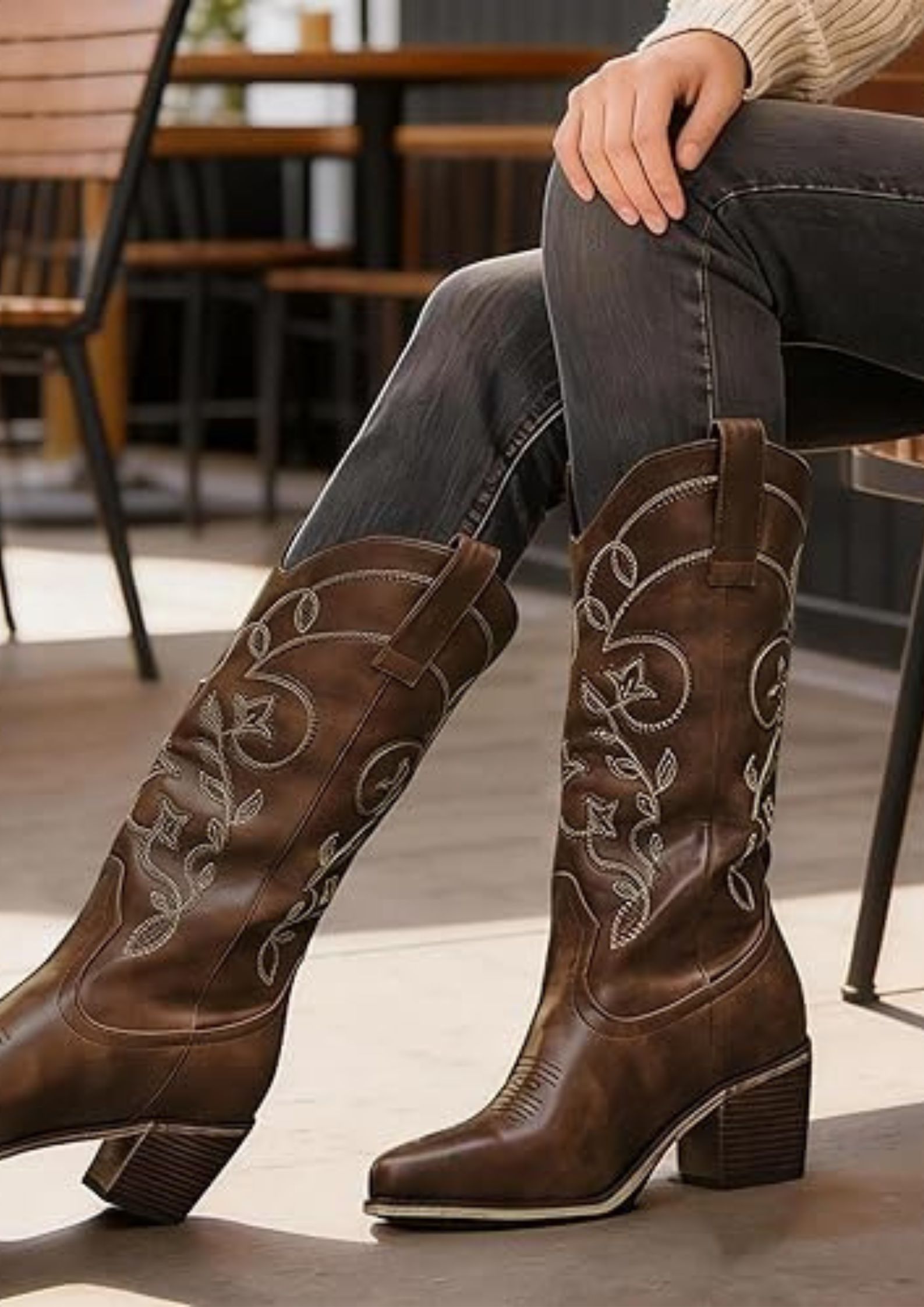 For bold fashion lovers, tall brown cowboy boots offer a striking silhouette. These boots are especially popular among women who want leg-lengthening style and dramatic Western aesthetics.